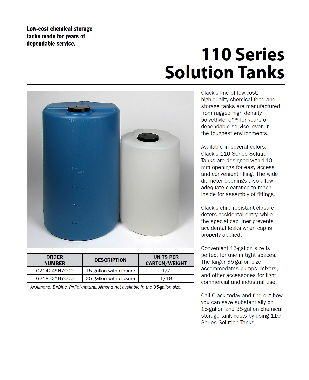 Available in several colors, Clack’s 110 Series Solution Tanks are designed with 110 mm openings for easy access and convenient filling. The wide diameter openings also allow adequate clearance to reach inside for assembly of fittings.
