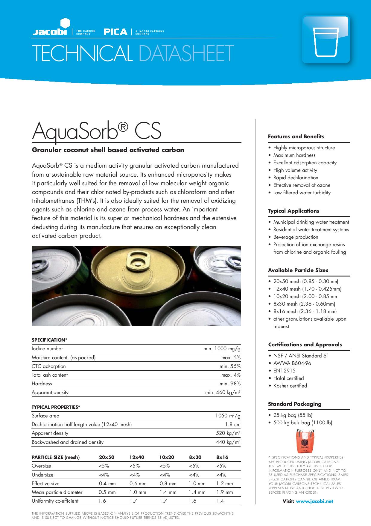 AquaSorb™ CS is a medium activity granular activated carbon, produced from a sustainable raw material. Its enhanced microporosity makes it particularly suitable for the removal of low molecular weight organic compounds and their chlorinated by-products, such as chloroform and other trihalomethanes (THMs). It is also ideally suited for the removal of oxidizing agents, such as chlorine and ozone, from process water. An important feature of this material is its high mechanical hardness and the extensive dedusting during production, ensuring an exceptionally clean activated carbon product.