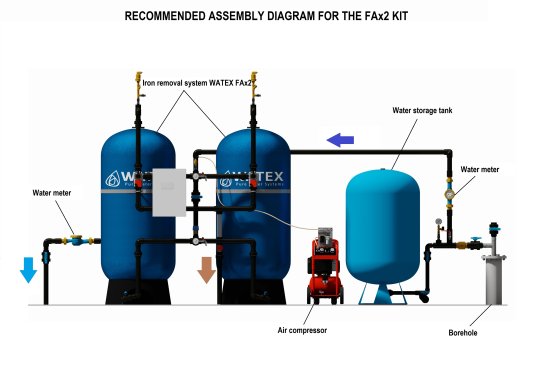 FA filter operating principle is based on aeration and filtration. When water is aerated, iron, manganese and mechanical impurities form sediments, which can be filtered. Suspended solids are filtered through filtration media, which has been poured in to filter. Filters depending on pollution levels and water consumption have to be rinsed regularly. Filters after rinsing are regenerated and can purify water. Equipment consists from filter and compressor. The equipment is fully assembled in the factory and only has to be connected to water, sewage water system, electricity and it will be operational.