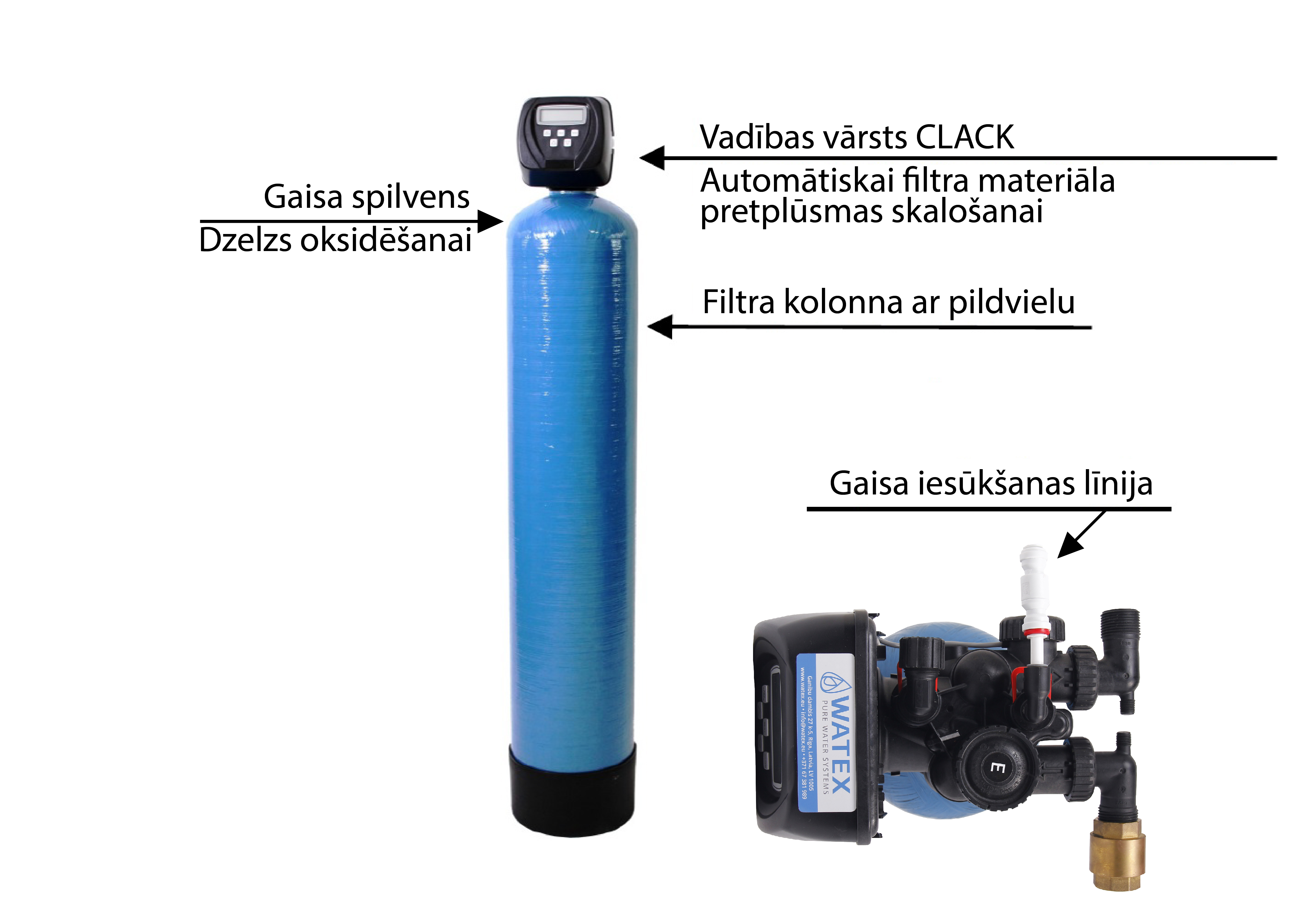 WATEX CMB13 is automatic water filter for water treatment that can filtrate iron, manganese, odour, turbidity and arsenic, without the use of any reagents. It is based on the oxidation and filtration method. WATEX CMB consists of filter tank, automatic control valve and filtration media. Due to air pillow in the tank, substances that are in water are oxidized and filtered. Filter need drain and electricity connection. Filter is designed for high flow rate and low pressure loss. Rinsing water can be directly discharged to biological wastewater treatment plant.