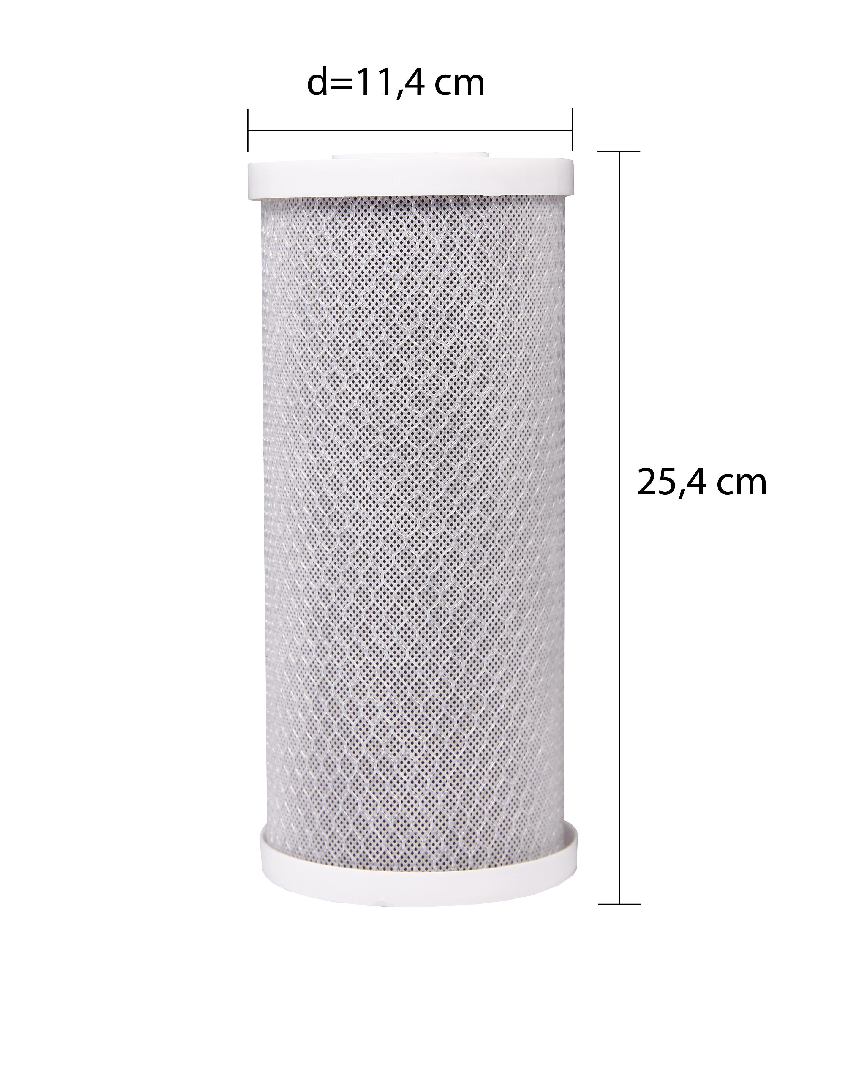 Replaceable filter element – carbon block cartridge designed to improve water taste and odor, as well as to reduce organic impurities and chlorine. Provides effective mechanical particle retention down to 20 microns.