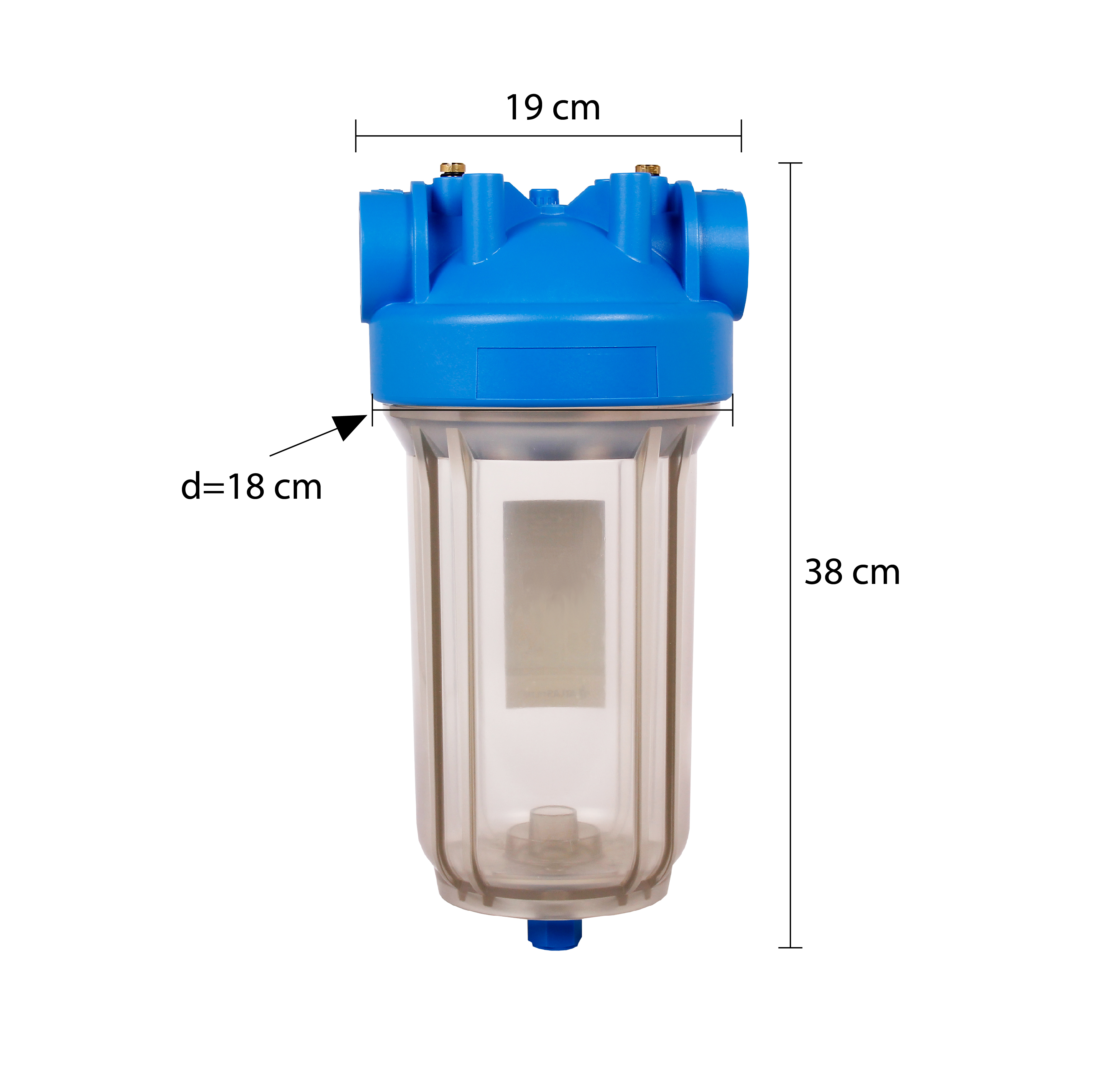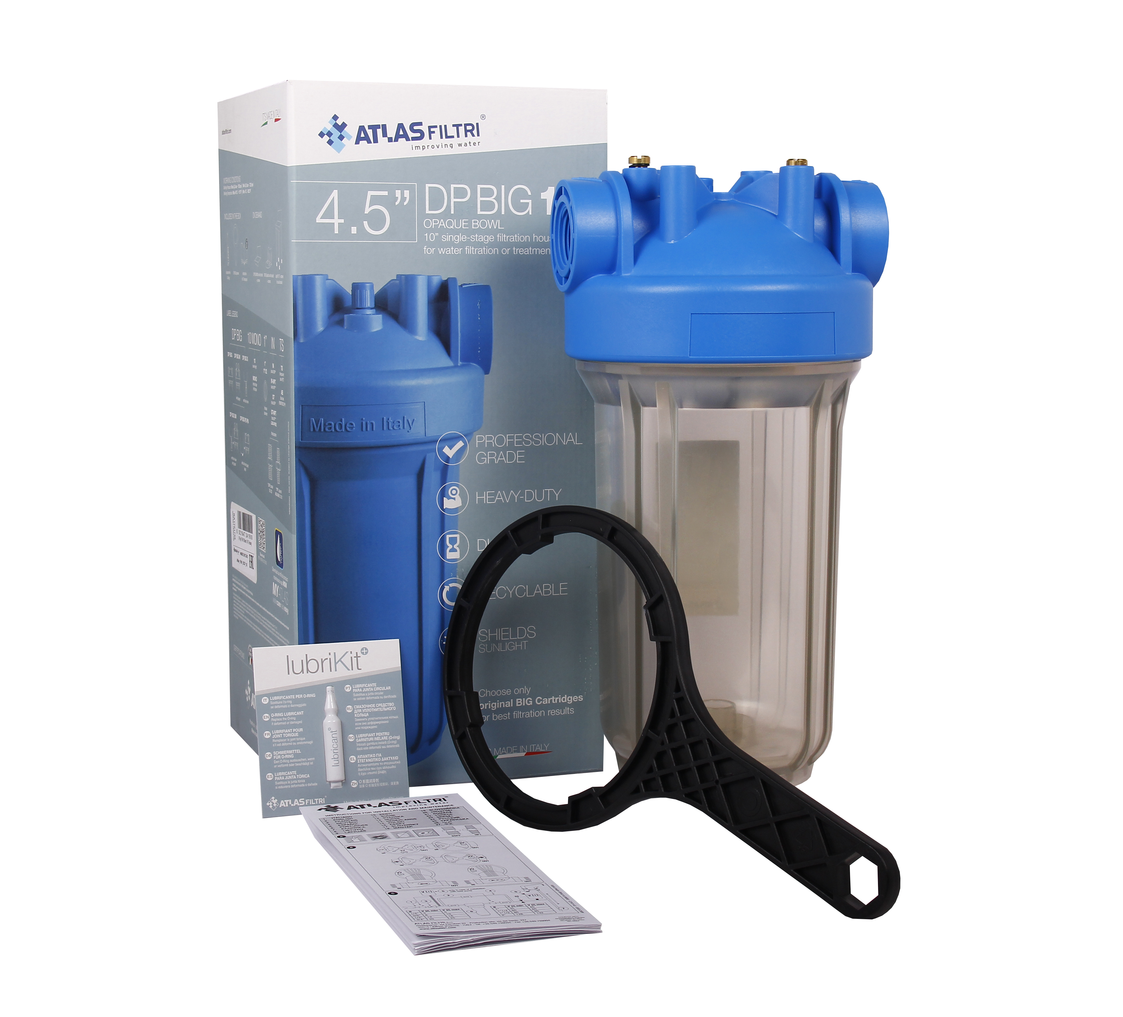 Description. BIG BLUE MONO 10" is a single-stage cartridge housing for SX (DOE) cartridges with an outer diameter of 4.5". The PS PM version is supplied with plugs on the heads and bowls and is prepared for connecting pressure gauges and a drain valve (devices not included).