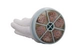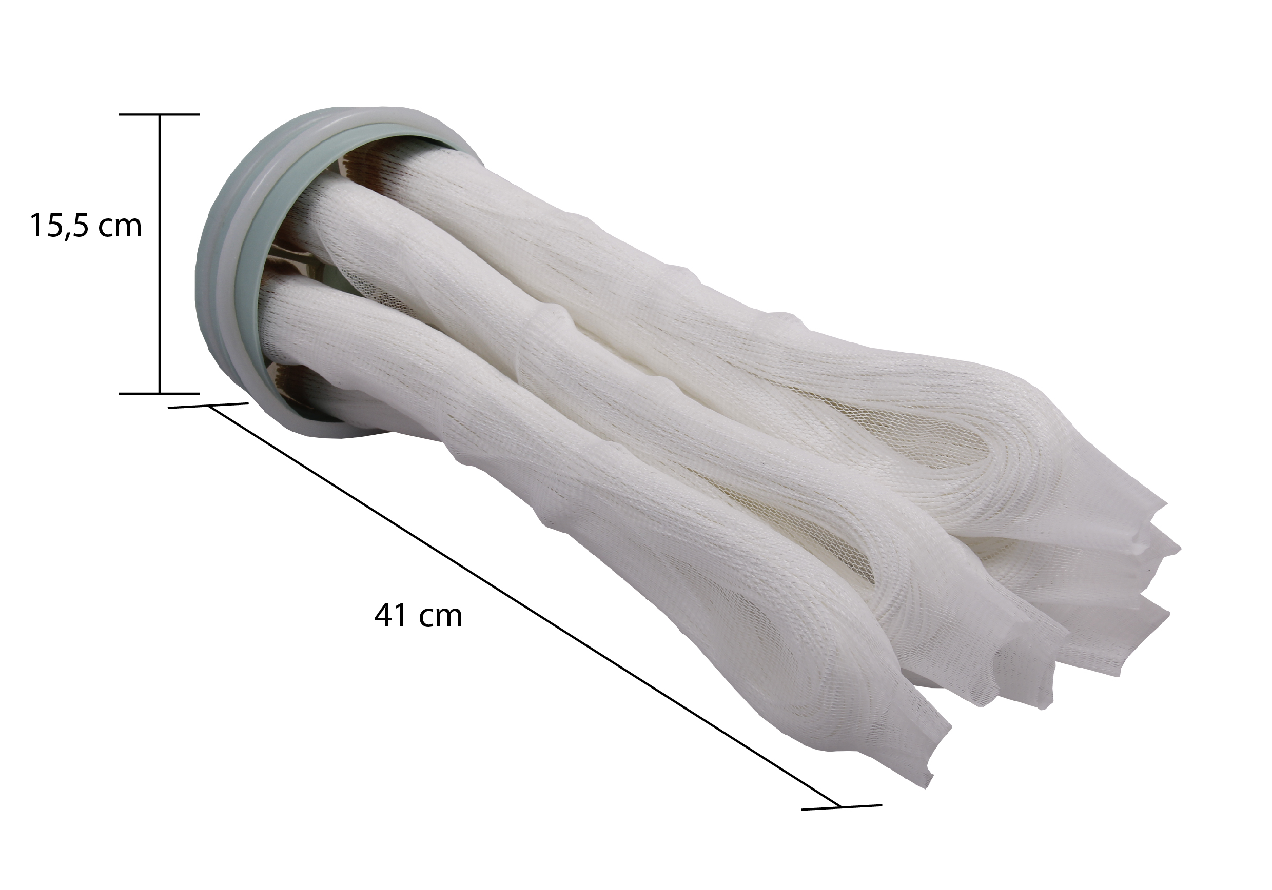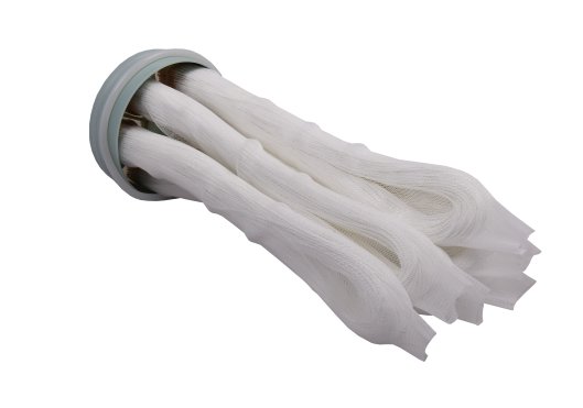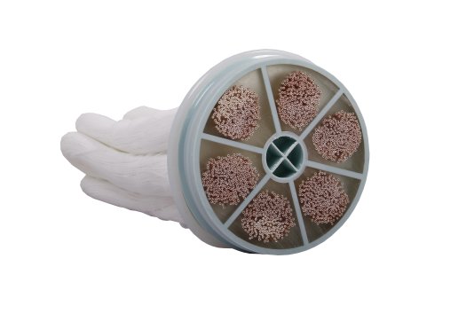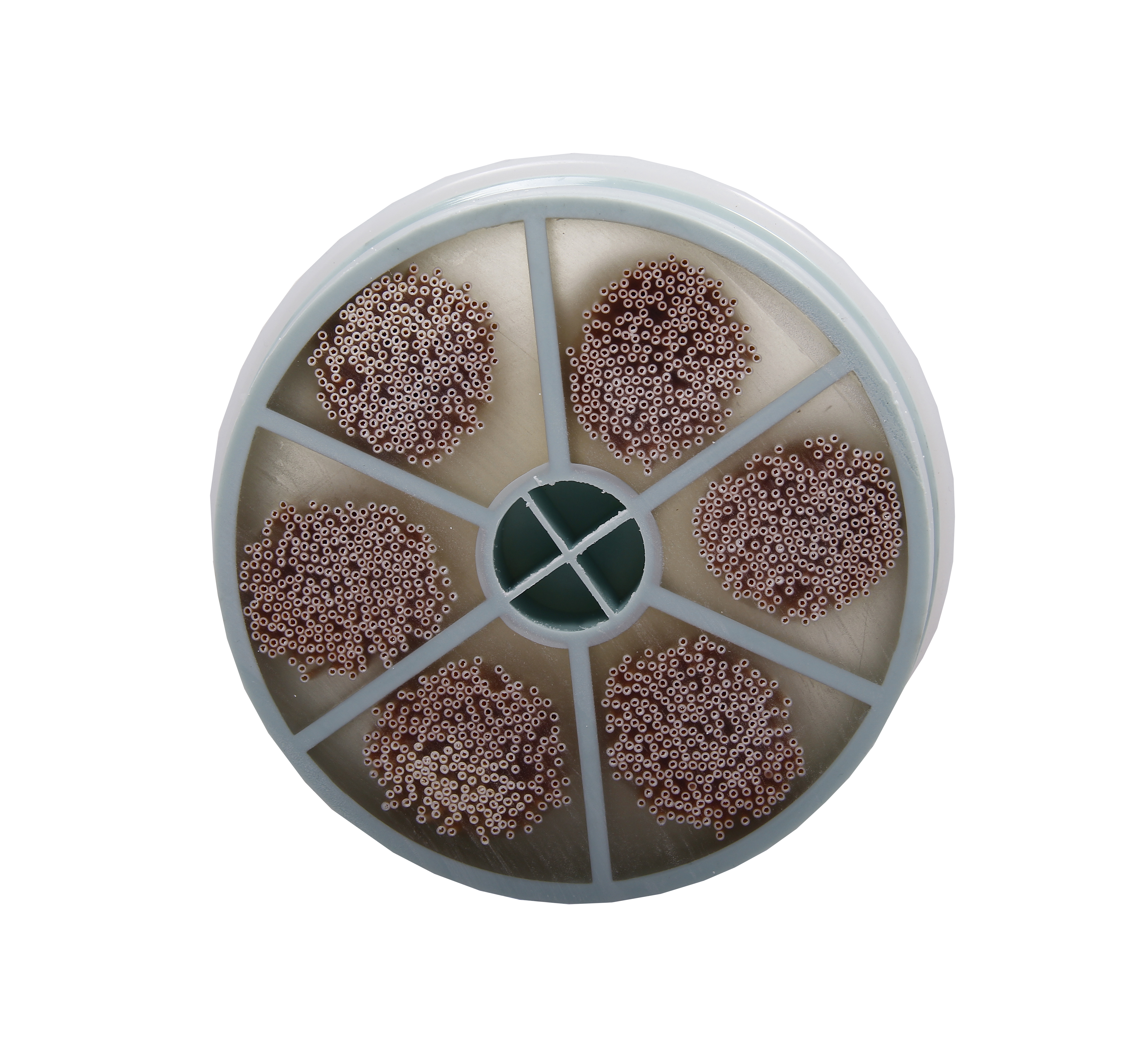 Compact hollow-fiber UF module with six fiber bundles hermetically potted in the header (epoxy potting). Operating mode — outside-in flow (outside → inside), ensuring removal of turbidity and microorganisms at low pressure.