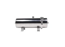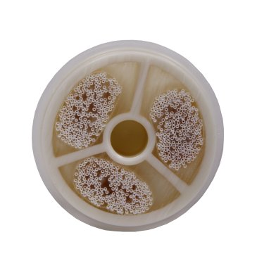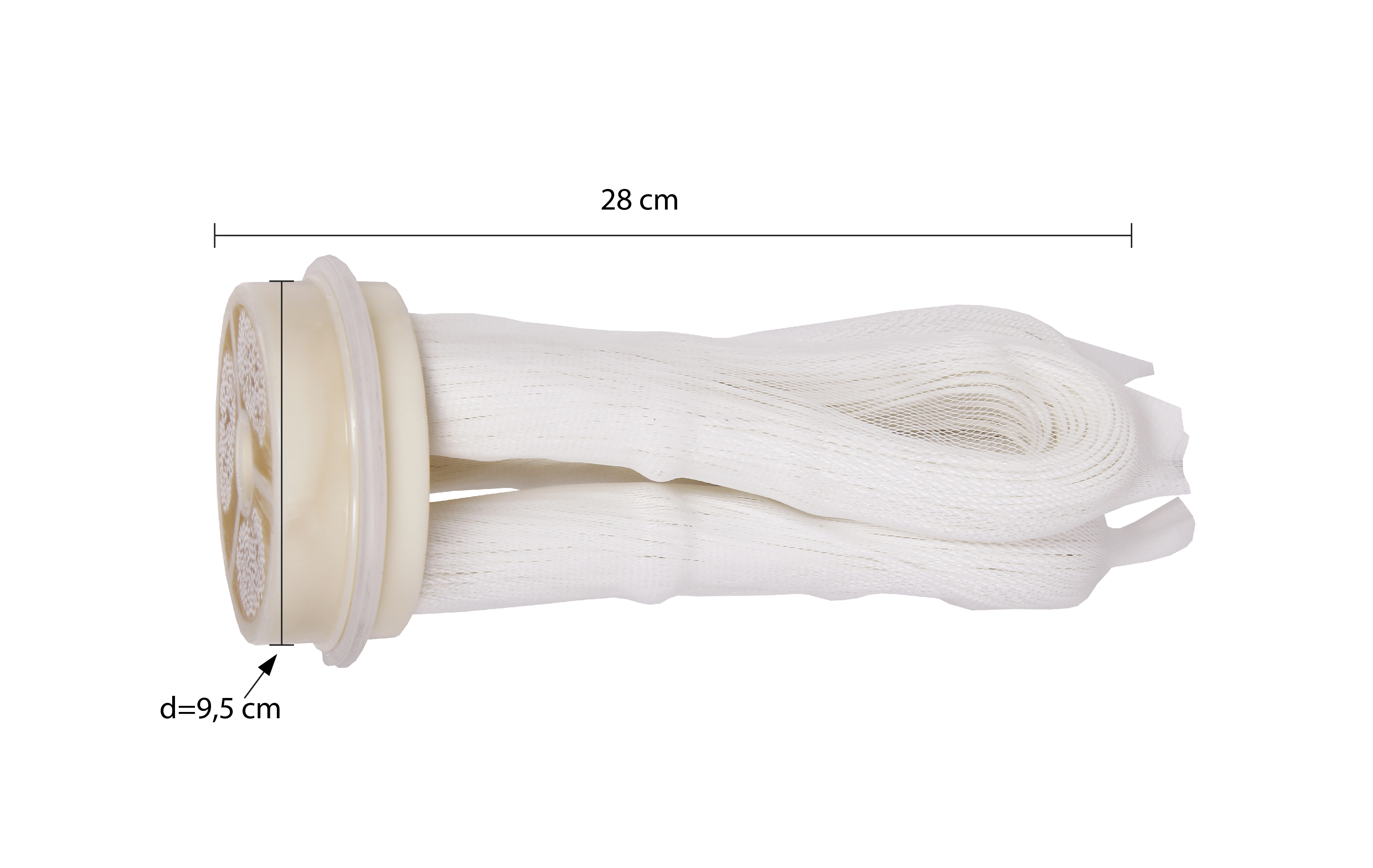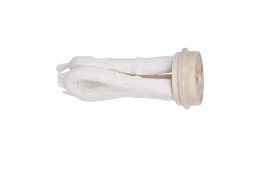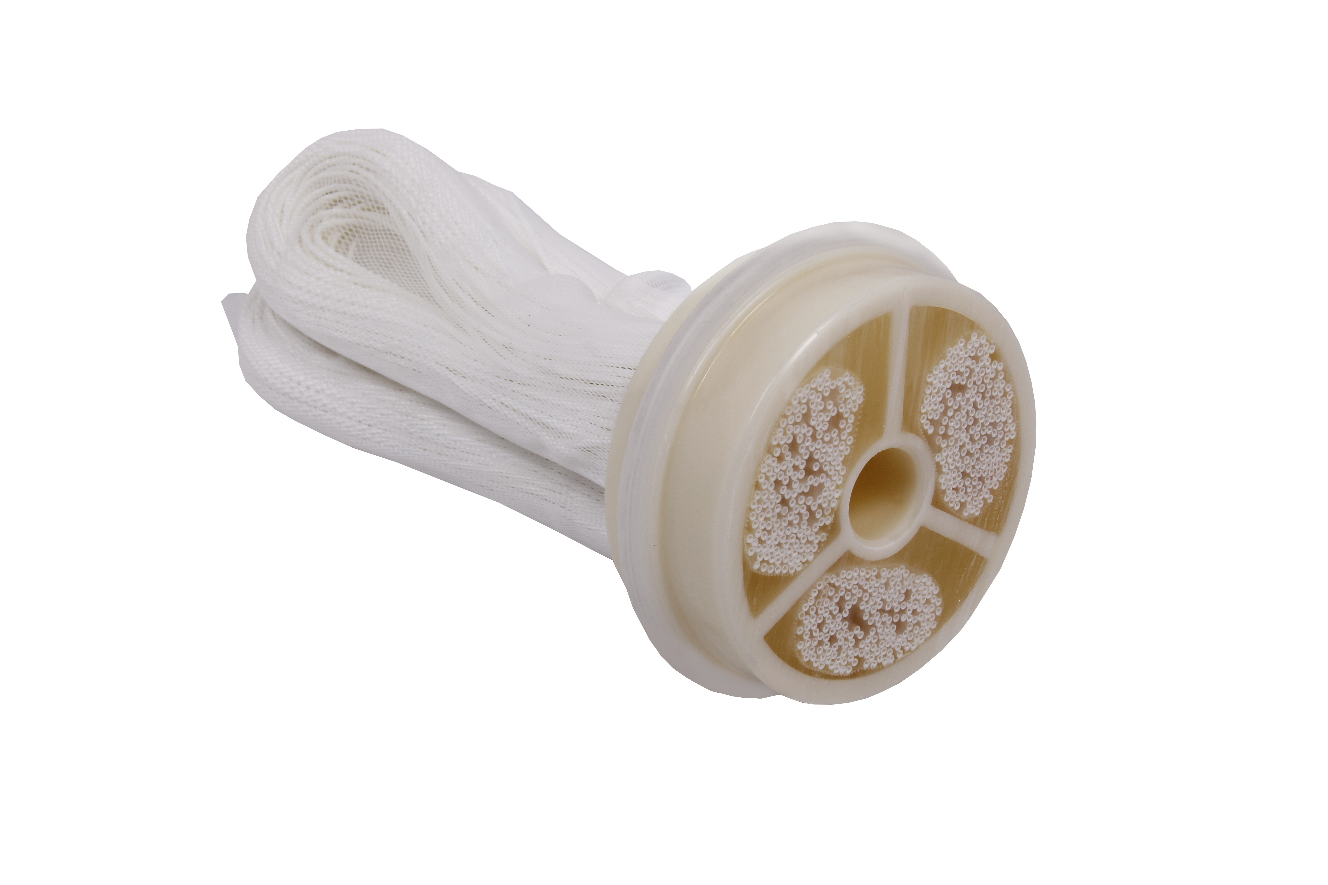 Compact hollow-fiber UF module with six fiber bundles hermetically potted in the header (epoxy potting). Operating mode — outside-in flow (outside → inside), ensuring removal of turbidity and microorganisms at low pressure.