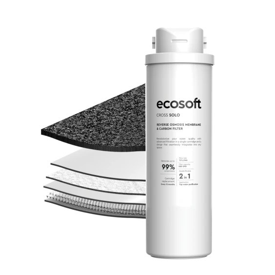 Šī augstas klases kārtridža komplekts ir paredzēts speciāli sistēmai ECOSOFT CROSS Solo, un nodrošina efektīvu un uzticamu dzeramā ūdens attīrīšanu. Tā 2-in-1 konstrukcija apvieno gan reverzās osmozes membrānu, gan kokosriekstu bāzes aktīvās ogles posmkārtridžu, noņemot līdz pat 99 % piesārņotāju — tostarp baktērijas, vīrusus, PFAS un citus organiskos savienojumus.