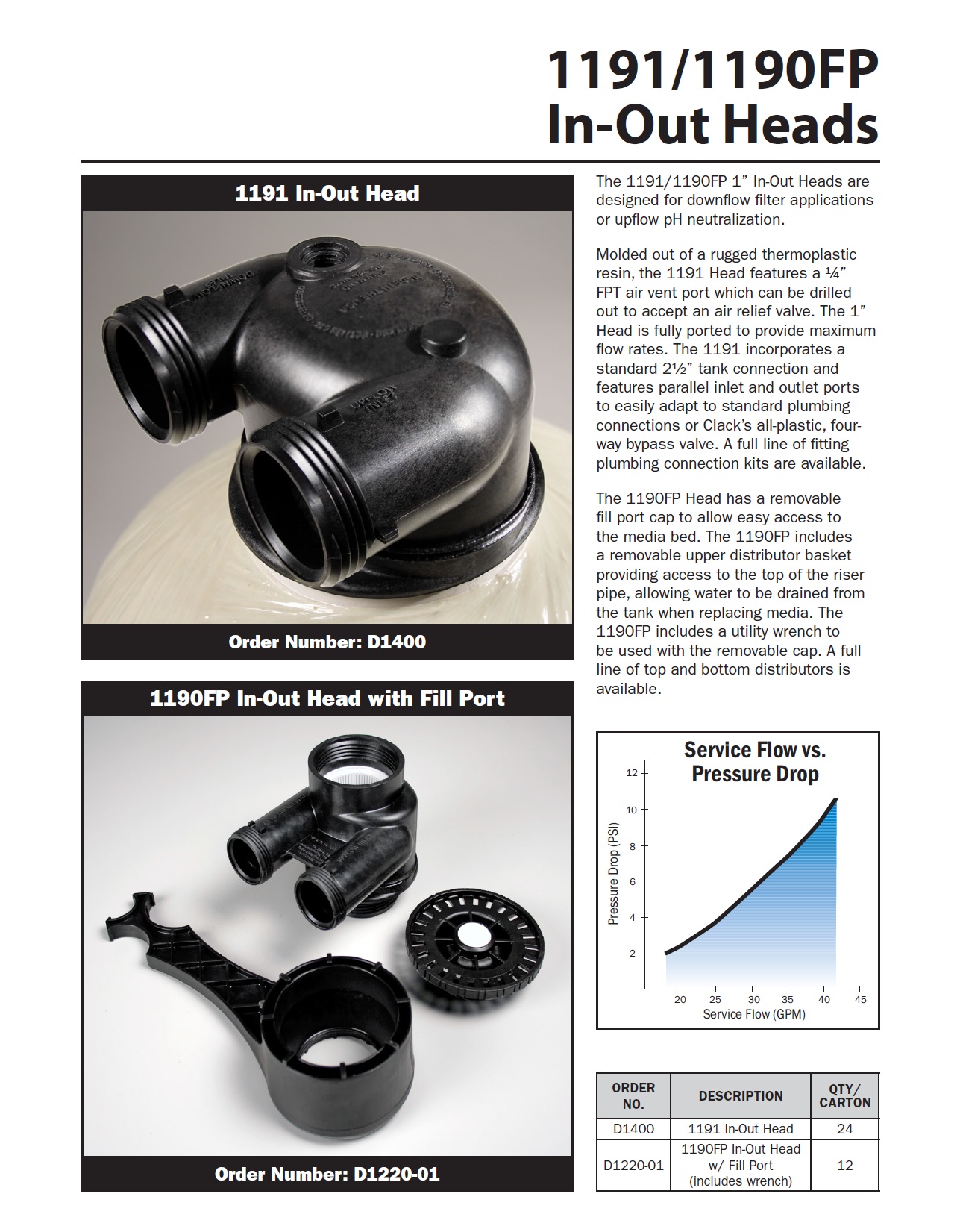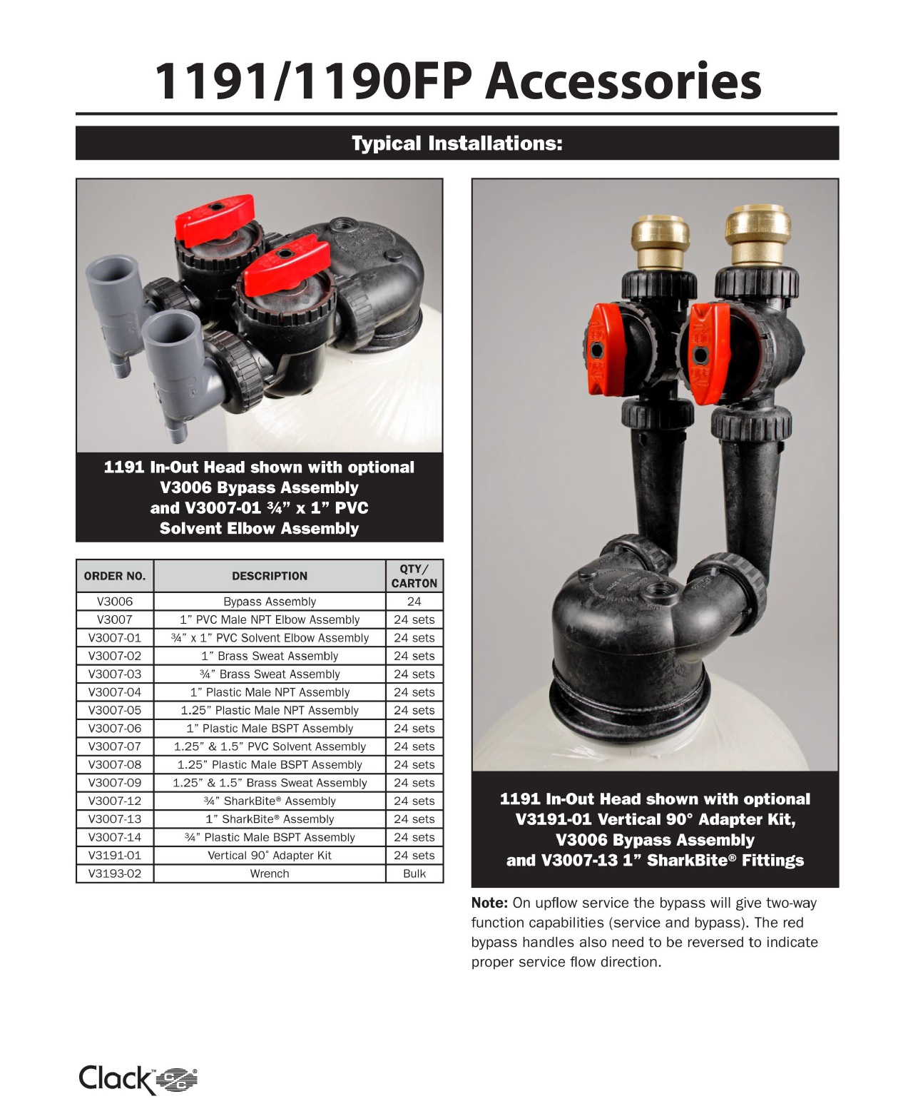 Modelis 1191 izmanto standarta 2½’’ tvertnes savienojumu un tam ir paralēli ieplūdes un izplūdes porti, kas viegli pielāgojas standarta santehnikai vai Clack plastmasas četrvirzienu apvades vārstam. Pieejami pilni savienojumu komplekti.