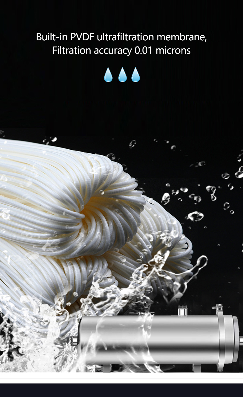 Sistēma izgatavota no nerūsējošā tērauda AISI-304 ar augstas veiktspējas PVDF ultrafiltrācijas membrānām (0,01 mikrona). Iebūvētie manometri un krāni ļauj kontrolēt spiedienu un veikt manuālu membrānu skalošanu.